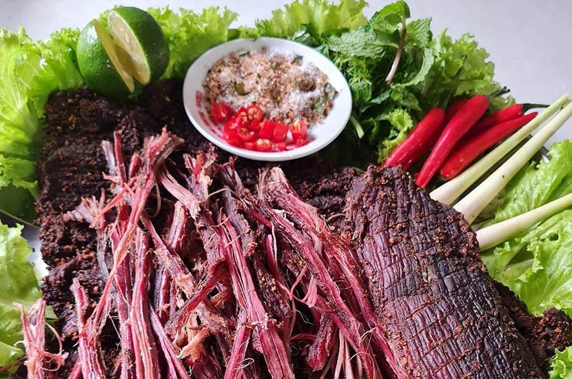 Bò gác bếp: Cao Bằng là nơi nuôi nhiều bò. Thịt bò dùng để sấy khô loại nào cũng ngon, không kén chọn.Thịt được xẻ ra thành từng miếng to nhỏ tùy ý. Nhưng thường to chừng hai ba ngón tay, dài chừng gang tay là vừa nhất. Thịt được tẩm ướp bằng muối, nước cốt gừng và đặc biệt không thể thiếu rượu trắng.