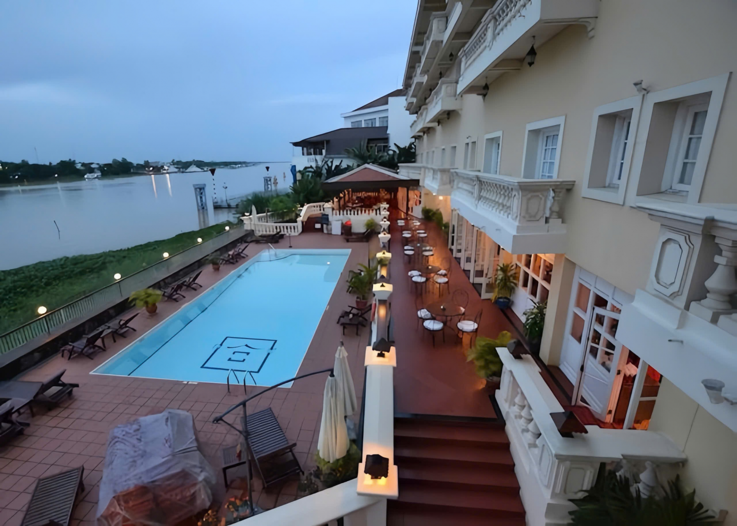 Khách sạn Victoria Châu Đốc - view ven sông sang trọng với hồ bơi ngoài trời, không gian thư giãn lý tưởng lúc hoàng hôn.